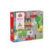 Puzzle In der Stadt! mit 48 Teilen und Lupe. Findest du die Gegenstände und Tiere, die sich im Bild verstecken?