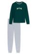 Der lange Schlafanzug besteht aus einem dunkelgrünen Langarmshirt mit gestreiftem Rundhalsausschnitt und „SINCE 1875 RELAX“-Schriftzug sowie einer grau-melierten Schlafhose mit Softbund.