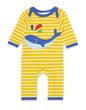 Garantiert süße Träume verspricht unser gelb-weiß gestreifter Schlafanzug mit süßer Wal und Fische Applikation. Ein praktischer Schlupfausschnitt am Hals und Druckknöpfe am Bein erleichtern das Umziehen. Dieser Einteiler für Meerestiere Fans ist aus weicher, zertifizierter Bio Baumwolle gefertigt.
