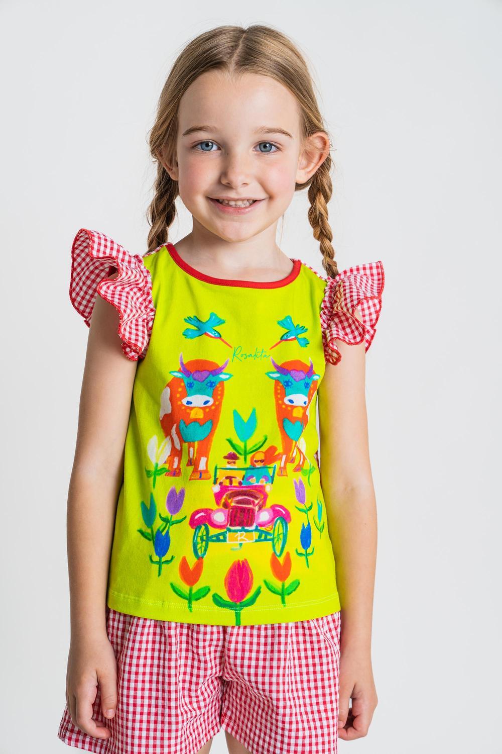 Das fröhliche T-Shirt mit Kuh-, Auto- und Blumenmuster und kurzen Ärmeln mit rot-weißen Rüschen ist ein absoluter Hingucker und wird sicher das Lieblingsteil des Sommers!